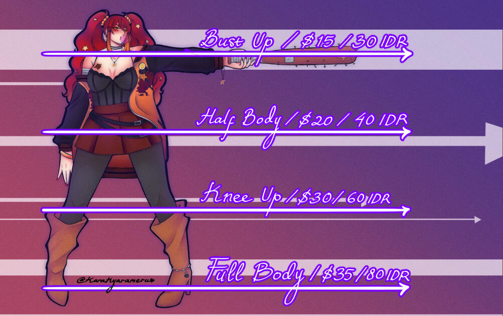 Illustration only includes simple background (color, simple ornamemt, pattern, etc) if + Proper Background (i. e park, garden, beach) = $ 5 / Rp 10-20k